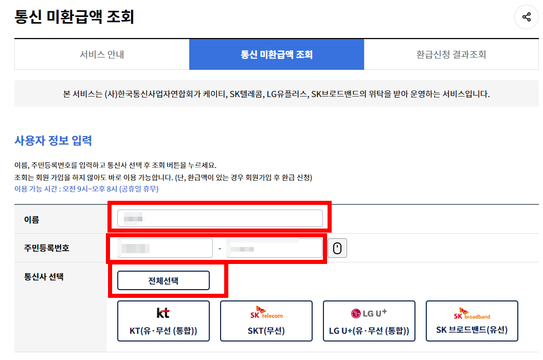 🔗스마트초이스사이트접속 >상단의 ≡ 표시 >환급/혜택 > 통신미환급액조회 > 정보입력 후 조회 > 조회결과확인