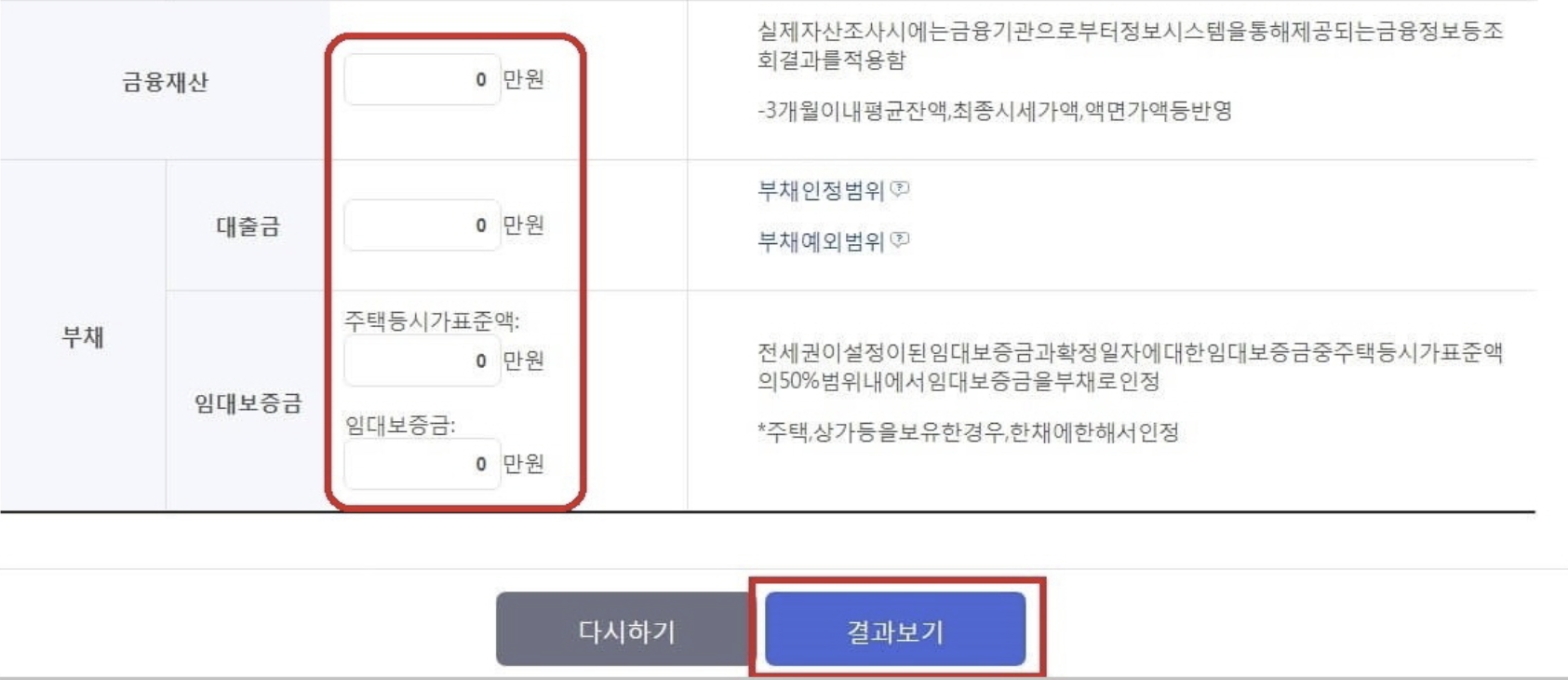재산정보입력시 일반재산과 금융재산, 부채에 대한 항목을 모두 작성한후 결과보기를 클릭합니다.