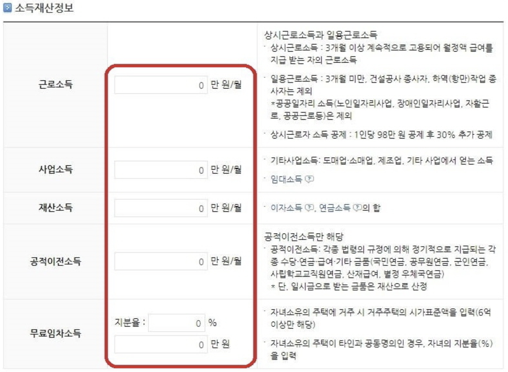 소득정보는 근로, 사업, 재산, 공적이전소득, 무료임차소득 을 입력하면됩니다.