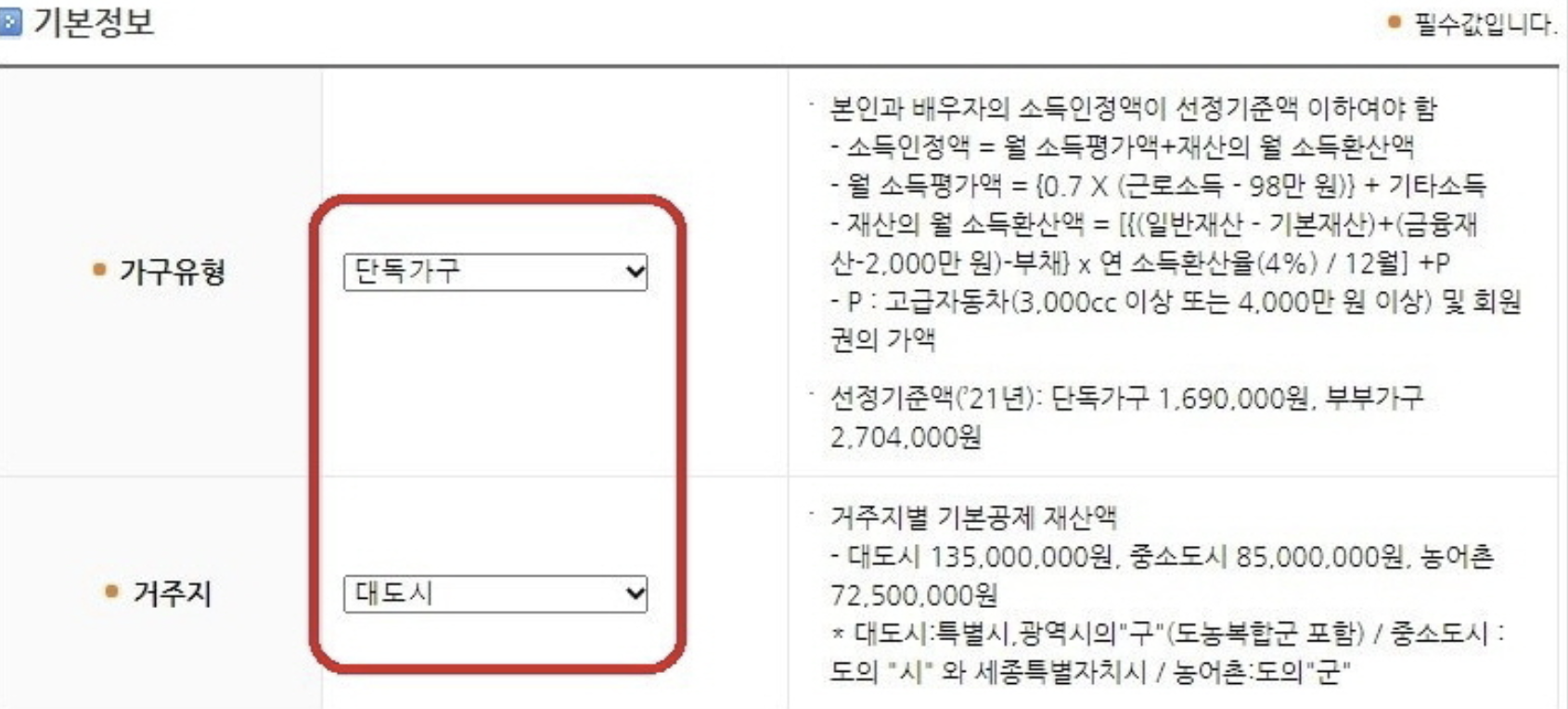 기본정보는 가구유형과 거주지를 선택합니다.
