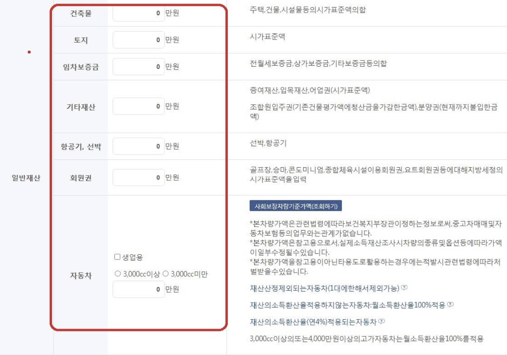 일반재산정보를 입력할때는 해당되는 재산사항에 대해 모두 작성해야 합니다.