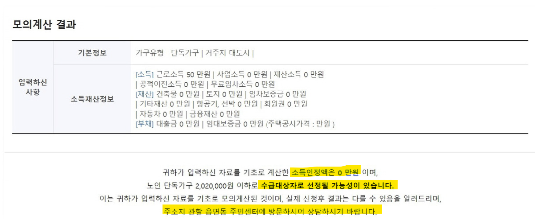 모의계산결과 소득인정액 금액과 수급대상자로 신청이 가능한지 여부를 안내하는 내용을 확인후 관할 주민센터에 연락하여 방문상담후 신청하시면 됩니다.
