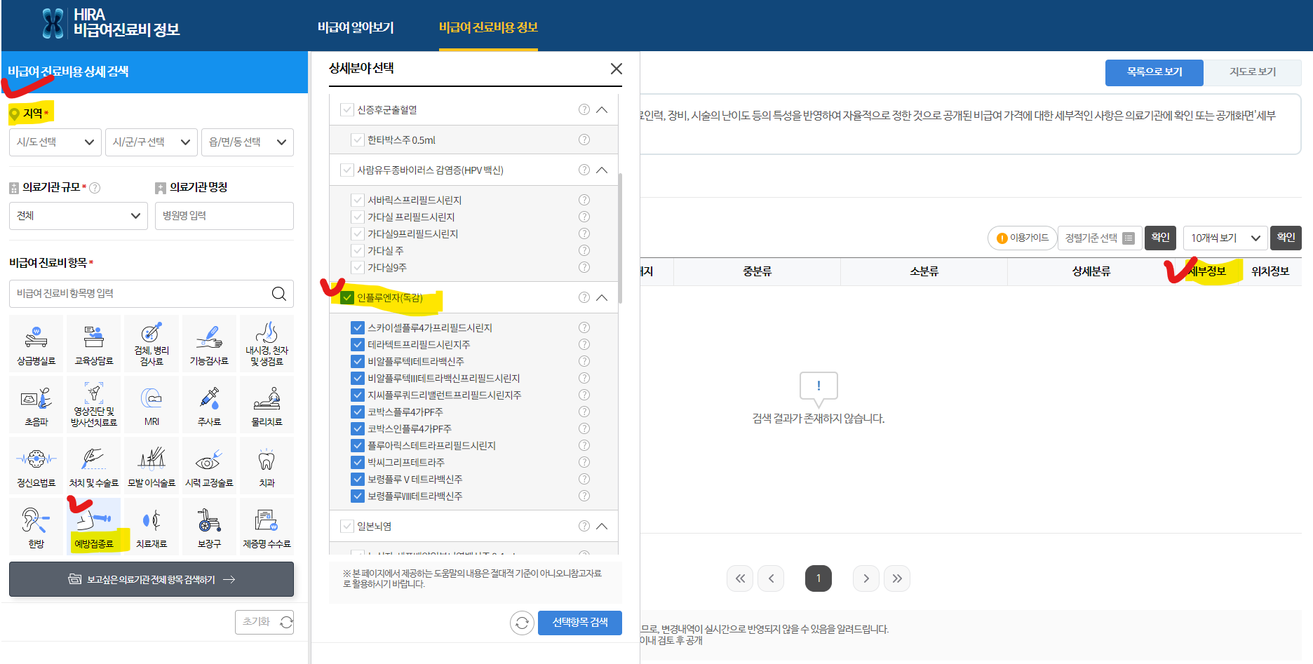 상단에 있는 독감예방접종비용 최저가 찾기 클릭 >지급여 진료비용 상세검색 > 지역선택> 비급여진료항목중 예방접종료선택> 상세분야선택 - 인플루엔자백신 전체선택 > 선택항목검색 > 동네에 병원리스트 나오면 세부정보 클릭하여 예방접종비용 확인.