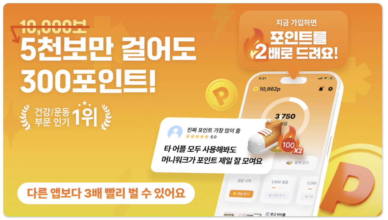 여러가지 건강 걸음체크 앱이 많지만 머니워크는 1만보가 아닌 5000보만 걸어도 300포인트가 지급되기때문에 다른앱보다 최대 3배까지 앱테크를 빠르게 할수 있습니다.