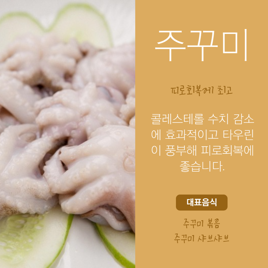 타우린이 풍부하여 피로회복에 좋고 영양만점인 해산물이 주꾸미 이다. DHA등의 불포화 지방산을 다량 함유하고 있어 혈중 콜레스테롤 수치 감소에 효과적이다.