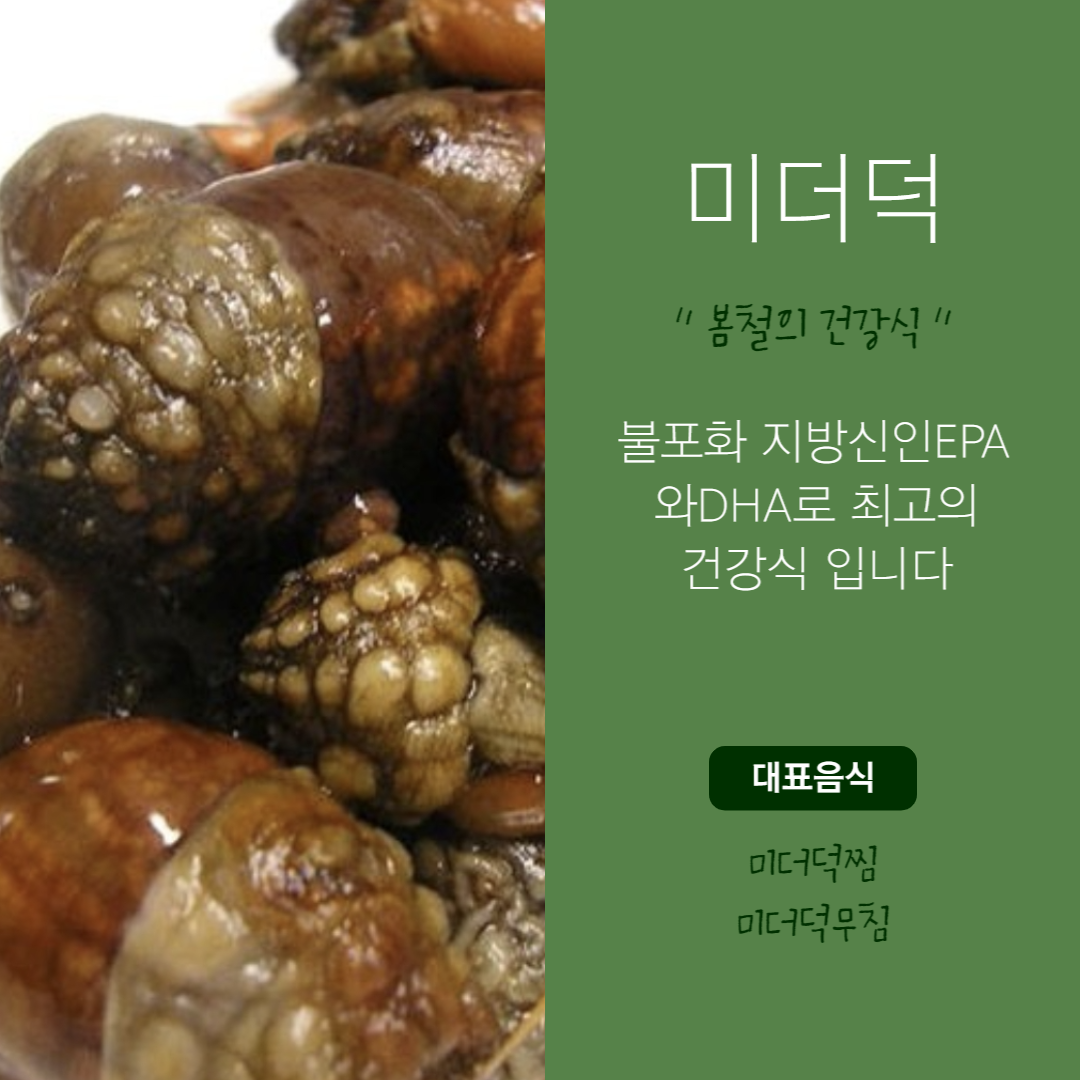 나른한 봄철에 오도독 오도독한 식감으로 입맛을 돋우어 주는 음식이 바로 미더덕 이다. 미더덕에는 불포화 지방산인 EPA와 DHA가 들어있는데 EPA는 동백경화, 고혈압, 뇌출혈의 예방에 효과가 있고, DHA 는 학습기능 향상, 혈중 콜레스테롤함량 저하. 항암작용, 노화 억제 등에 효과가 크다.