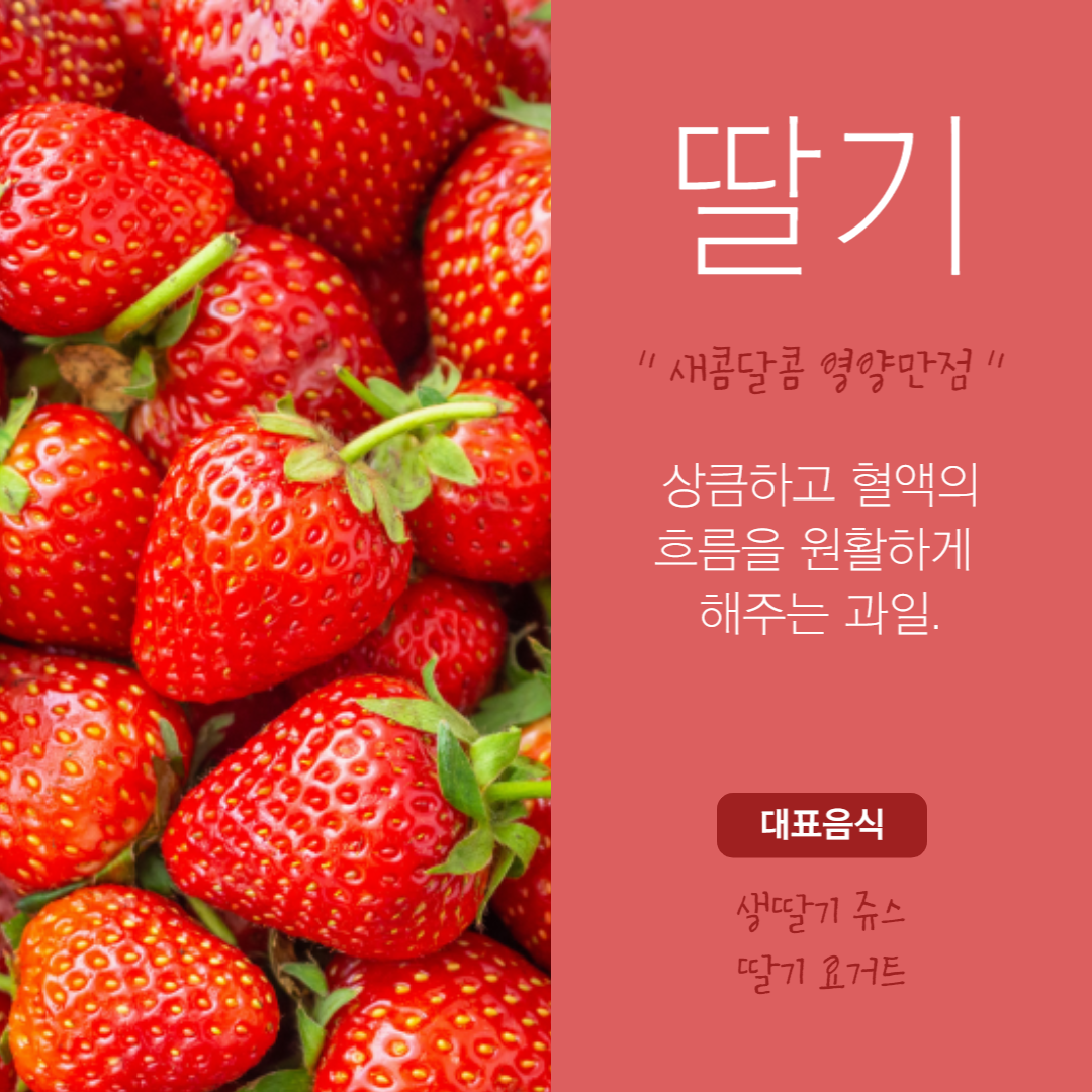 과일 중에서 비티민C가 가장많은 딸기는 하루에 4개 정도를 섭취하면 비타민C의 하루섭취량을 모두 먹는것과 같다고 합니다. 딸기는 비타민이 레몬에 두배나 되며 펜틴이라는 식이섬유가 매우 풍부해 혈액의 흐름을 원활 하게 해줍니다.