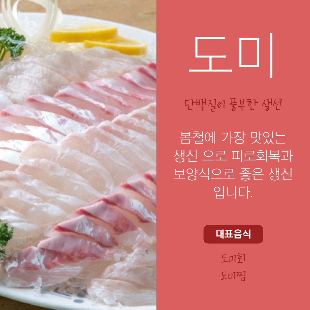 봄철이 가장 맛있는 생선으로 지방이 적고 살이 단단해서 비만이 걱정되는 중년기에 좋은 식품이 바로 도미 이다. 단백질이 풍부하고 지방질이 적어 수술 후 회복기 환자에게도 아주 좋은 생선이다.또한 도미의 눈에는 비타민 B1이 다량 함유돼 있어 피로회복에 좋고 도미 껍질에는 비타민 B2가 많다.