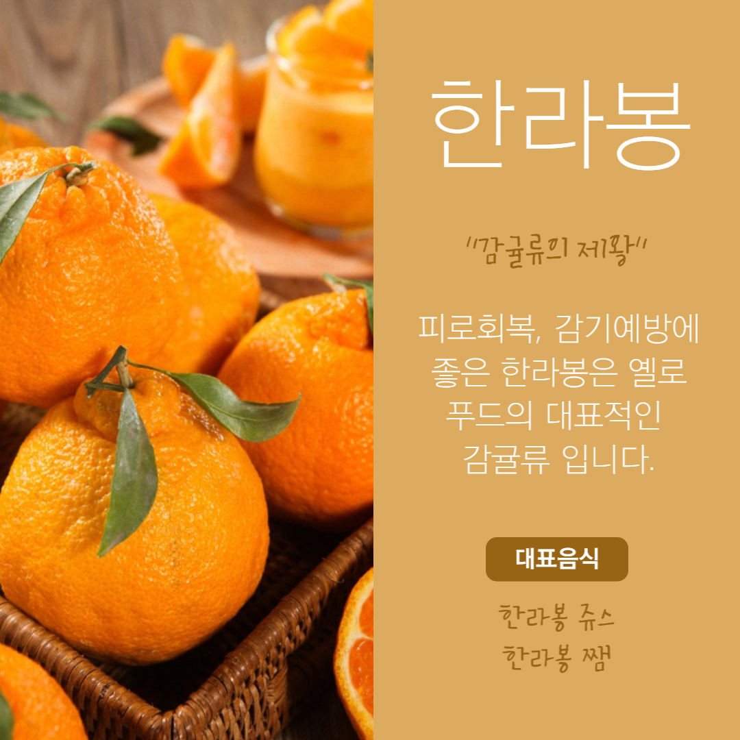 피로회복, 감기예방에 좋은 비타민C가 풍부하게 들어있습니다. 또한 열량이 낮아 다이어트시에도 적합한 음식이라고 하네요.옐로 푸드의 대표적인 감귤류 과일은 카르티노이드 성분이 들어있어서 뛰어나 항산화제로 알려져 있습니다.