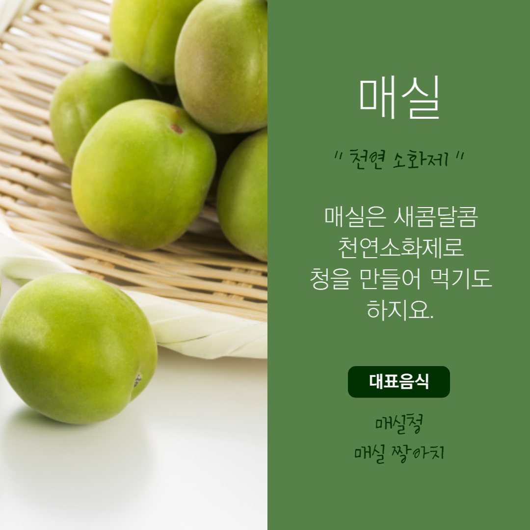 매실은 천연소화제 이면서 피로회복에 도움이되는 봄 제철 음식입니다. 식이섬유소가 많고 저열량.저지방으로 다이어트에 좋습니다.