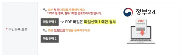7. 주민등록초본은 정부24를 통해 출력 시 PDF파일로 출력을 선택하시고 파일선택 1에 첨부하시면 됩니다.