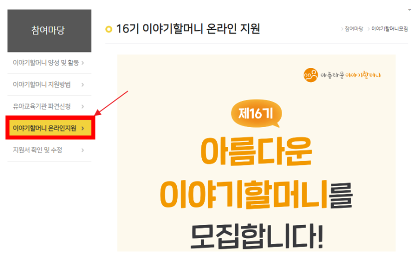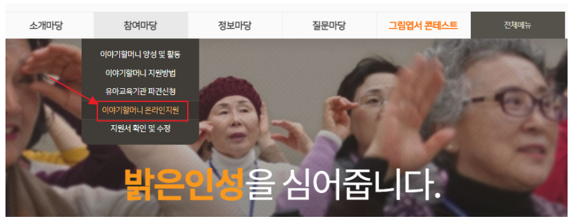 3. 참여마당 > 이야기할머니 온라인 지원을 클릭합니다