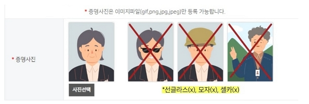 6.증명사진을 첨부해야 하며 아래와 같이 선글라스. 모자. 셀카 사진은 불가하니 반드시 증명사진을 최근 것으로 발급하시고 파일로 미리 받아 놓으시면 됩니다.