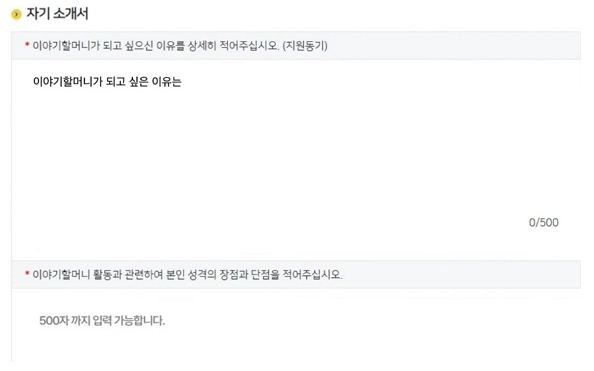 8. 자기소개서는 항목에 맞게 솔직하게 작성하면 됩니다. 장점에는 아이들을 좋아하고 이야기하는 걸 좋아하며 손주에게도 동화책을 읽어주면서 소통하는 걸 좋아한다는 뉘앙스로 작성하면 도움이 됩니다.