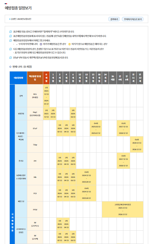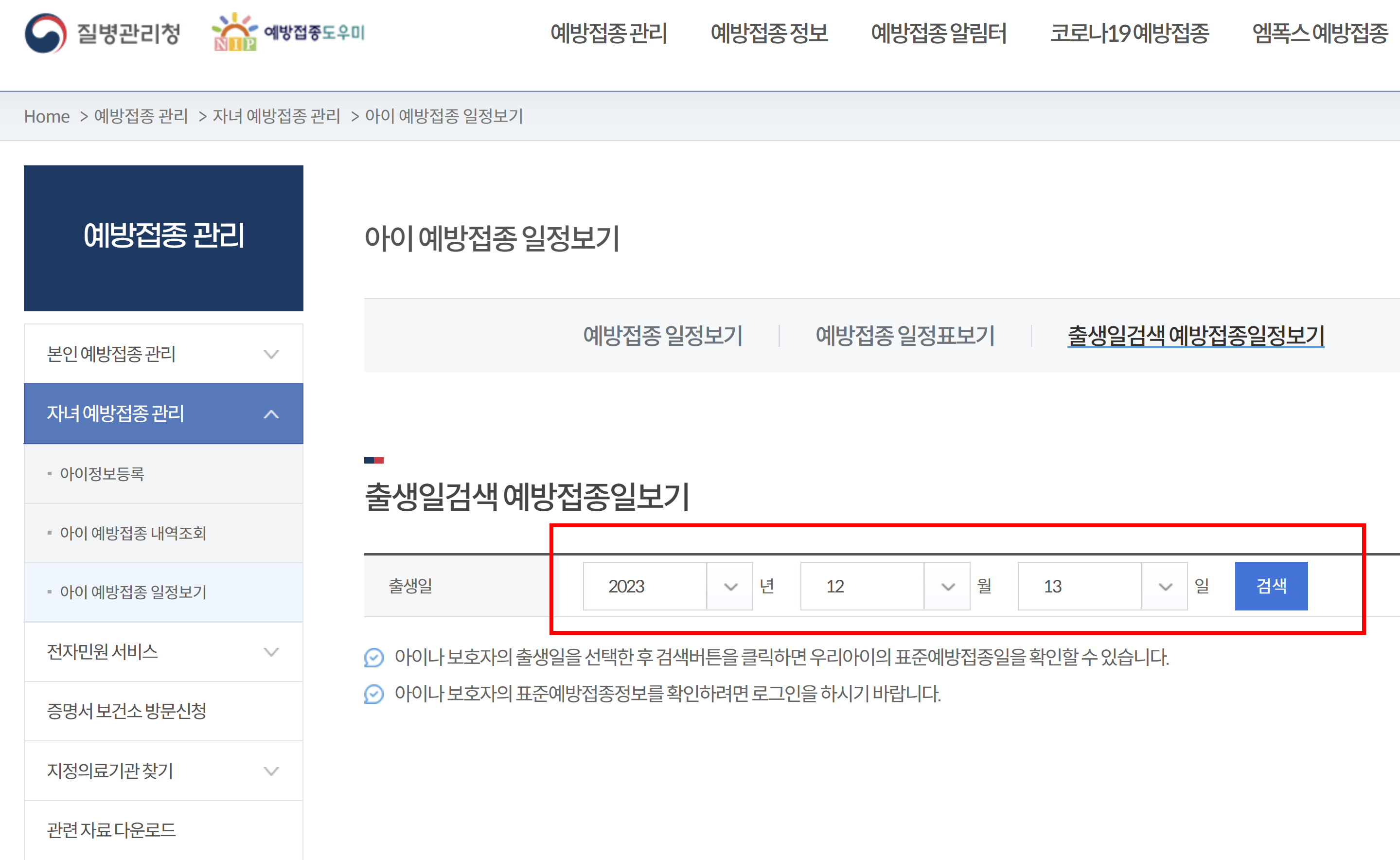 1.예방접종 도우미 사이트 접속 > 예방접종관리> 본인예방접종관리 >본인예방접종일정보기 >생년월일입력후 검색