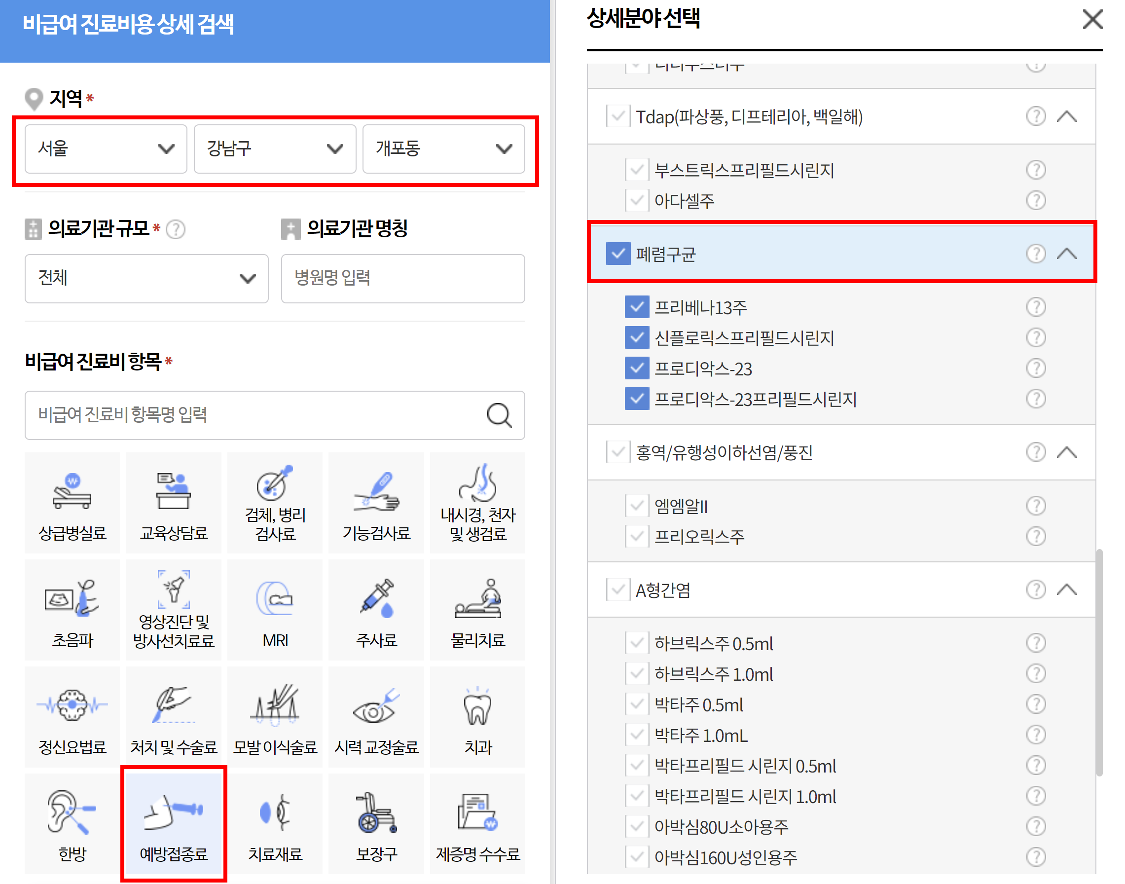 1.심사평가원 비급여진료비정보 > 거주지역 읍면동까지 선택> 진료항목중 예방접종료선택> 해당되는 예방접종백신선택>선택항목검색