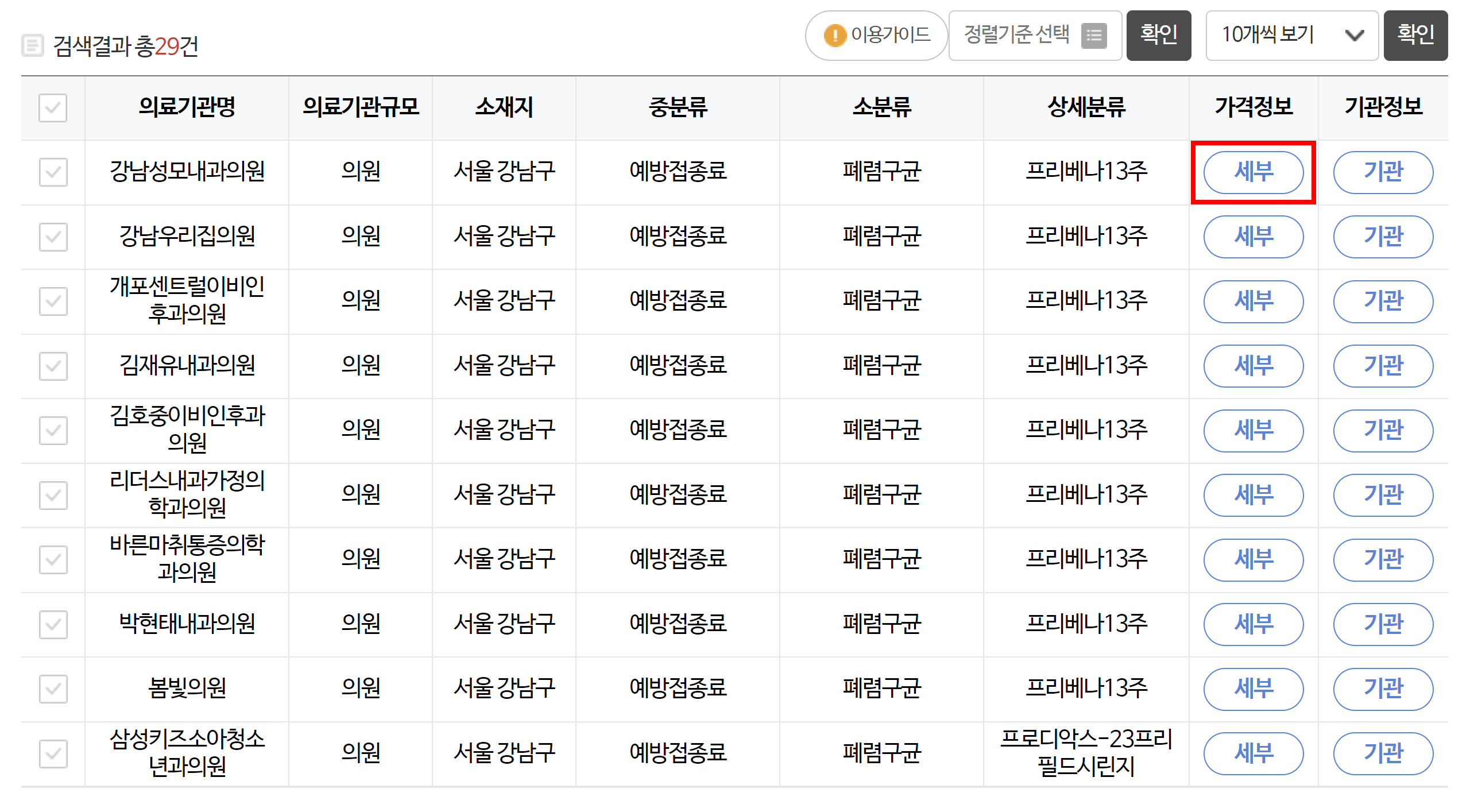 2.의료기관 목록 , 상세분류:접종백신이름 확인 > 가격정보부분에 [세부] 버튼 클릭>해당의료기관의 백신금액 조회됨