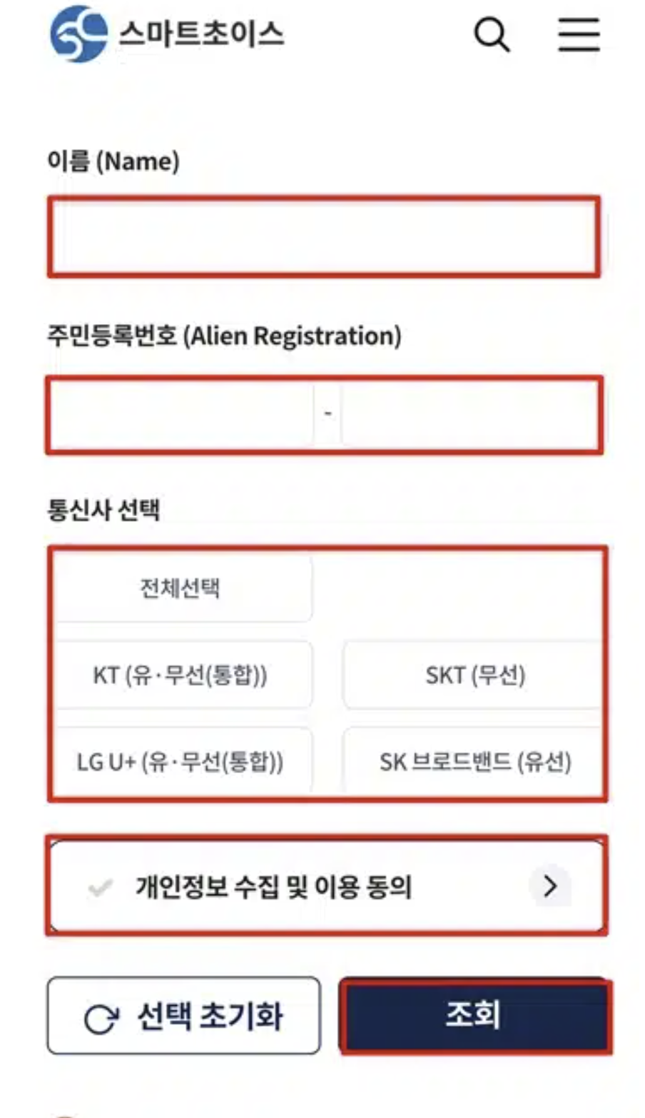 단, 만14세 미만. 법인. 가명. 외국인 가입자는 스마트 초이스 조회가 불가하기때문에 통신사 고객센터를 이용하는걸 추천합니다.