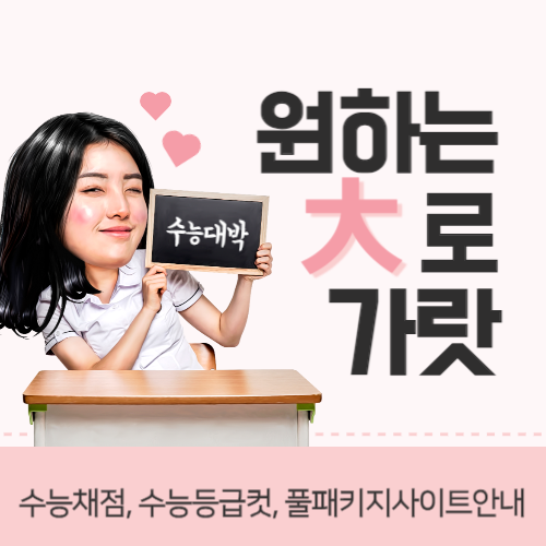 아래 사이트는 수능채점과 동시에 등급컷과 본인이 지원가능한 학교까지 안내가능한 풀패키지 서비스를 이용하실수 있습니다. 채점서비스 이용시 각종이벤트당첨기회도 높일수 있고, 정답채점후 점수 계산의 번거로움을 덜고 보다 전략적으로 이용가능 합니다.