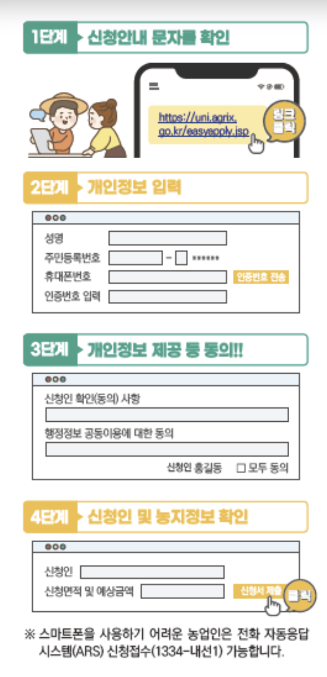 기본형 공익직불금을 비대면신청과 방문신청이 가능합니다.사전에 스마트폰으로 링크 안내를 받으신분들은 스마트폰을 이용하여 온라인으로 간편하게 신청이 가능하고 비대면 신청을 하지 못하신 분들은 읍면동 관할 지자체에 방문하여 신청하시면 됩니다.